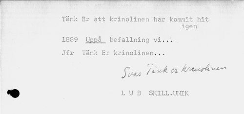 //// . v r" *—™ --- • • ¦ — ¦ — _ • //// Tänk Er att krinolinen har kommit hit //// igen //// 1889 Uppå befallning vi... Jfr Tänk Er krinolinen... //// n aW vi /VHA^™^ //// L U B SKILL.UNIK ////