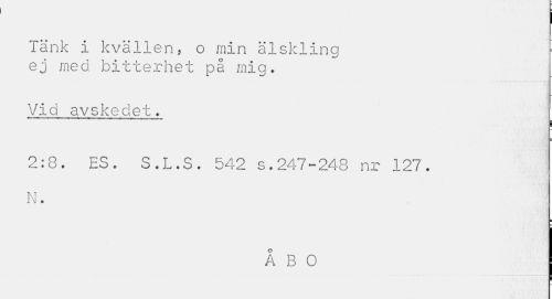 //// I //// Tänk i kvällen, o min älskling ej med bitterhet på mig. //// Vid avskedet. //// i //// 2:8. ES. S.L.S. 542 s.247-248 nr 127. N. //// i //// ÅBO ////