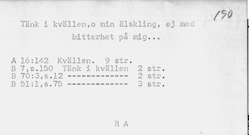 //// tio //// Tänk i kvällen n o min 3. lskling, ej med- l //// bitterhet på mig... //// A 16:142 Kvällen. 9 str. B 7,s.l50 Tänk i kvällen 2 str. //// B 70:3,s.12 ---2 str. //// B 51:1.s . 75 --- 3 str. //// i //// R A ! //// i //// V \ //// i ////