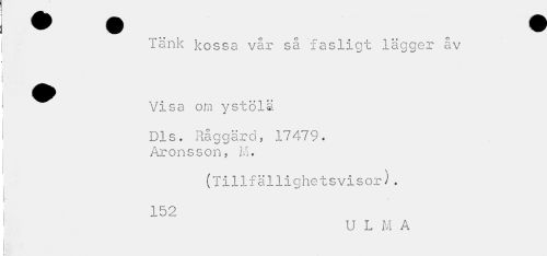 //// Tänk kossa vår så fasligt lägger åv //// ^^ Visa om ystölä //// Dis. Råggärd, 17479. Aronsson, M. //// (Tillfällighetsvisor). //// 152 //// U L M A //// i ////