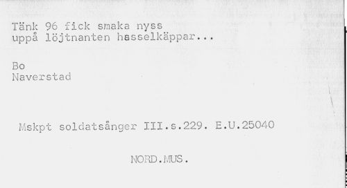 //// Tänk 96 fick smaka nyss^ //// uppå löjtnanten hasselkäppar... Bo //// Naverstad //// i //// i * \ //// \ //// \ .? : //// 1-1 ¦ l ' //// > //// Mskpt soldatsånger III.s.229. E.U.25040 //// NORD.MUS. //// i | //// I ////