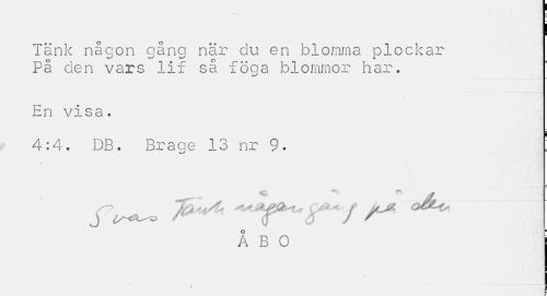 //// ¦ //// Tänk någon gång när du en blomma plockar På clen vars lif så föga blommor har. //// En visa. //// 4:4. DB. Brage 13 nr 9. ' //// ÅBO ////