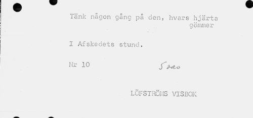 //// Tänk någon gång på den, hvars hjärta //// gömmer //// I Afskedets stund. //// LÖFSTRÖMS VISBOK ////