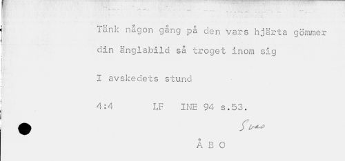 //// n i . s-, . . . , //// 7' * " - • . ^ ' • • .»-v ... //// r .-> •»-• ••¦< - * • --• ---, //// ¦ //// Tänk någon gång på den Vars hjärta gömmer din änglabiid så troget inom sig //// I avskedets stund //// 4:4 LF INE 94 s.53. //// A B O ////