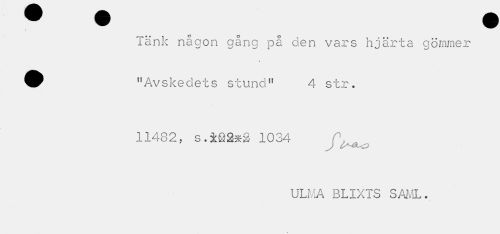 //// i ¦¦ - //// Tänk någon gång på den vars hjärta gömmer //// i //// w "Avskedets stund" 4 str. //// 11482, s.iQ2*8 1034 //// ULMA BLIXTS SAML. ////