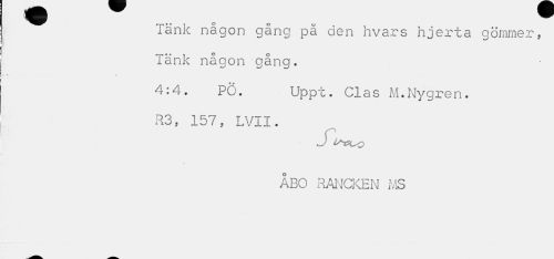 //// ^^ Tänk någon gång pä den hvars hjerta gömmer, //// Tänk någon gång. //// 4:4. PÖ. Uppt. Clas M.Nygren. R3, 157, LVII. //// J isrz^o //// \ //// ÅBO RANCKEN MS ////