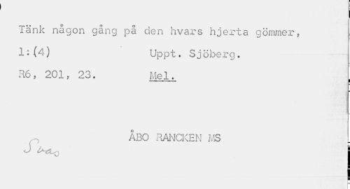 //// I //// Tänk någon gång på den hvars hjerta gömmer, J //// Uppt. Sjöberg. R6, 201, 23. Mel. //// ÅBO RANGKEN MS //// J ^Lq i //// r ////