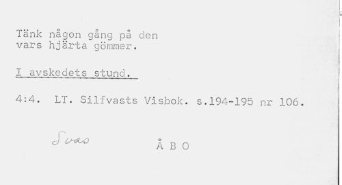 //// Tänk någon gång på den //// vars hjärta gömmer. j //// « //// I avskedets stund. //// 4:4. LT. Silfvasts Visbok, s.194-195 nr 106. //// Jl^uo ÅBO ////