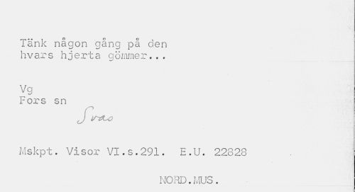 //// Tänk någon gång på den hvars hjerta gömmer... //// Vg //// Fors sn //// J mfU) //// Mskpt. Visor VI.s.291. E.U. 22828 //// NORD.MUS § ////