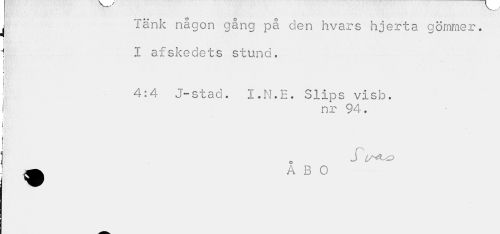 //// Tänk någon gång på den hvars hjerta gömmer. //// i //// | I afskedets stund. //// i //// i //// t //// ; //// 4:4 J-stad. I.N.E. Slips visb. //// i nr 94. //// I. //// S //// ä A B O ////
