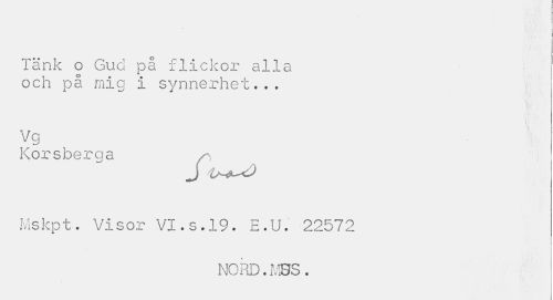 //// Tänk o Gud på flickor alla och på mig I synnerhet... //// Vg //// Korsberga //// J //// Mskpt. Visor VI.s.19. E.U. 22572 //// nord . ms. ////