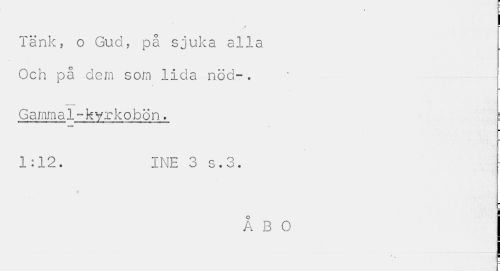 //// I //// J //// ¦¦ //// Tänk, o Gud, på sjuka alla Och på dem som lida nöd-. //// Gammal-kyrkobön. //// * //// 1:12. INE 3 s.3. //// - //// ÅBO I ////