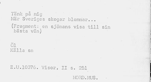 //// Tänk på mig //// När Sveriges skogar blommar. . . //// (Fragment: en sjömans visa till sin bästa vän) //// m //// i //// * » //// 01 //// Källa sn //// ¦ //// E.U.10376. Visor, II s. 251 //// NORD.MUS. ////