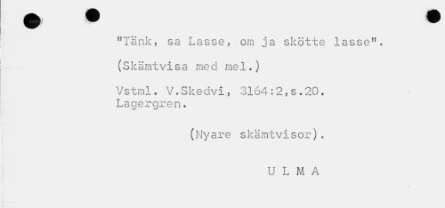 //// "Tänk, sa Lasse, om ja skötte lasse". //// (Skämtvisa med mel.) //// Vstrnl. V.Skedvi , 3164 :2, s. 20. Lagergren. //// (Nyare skämtvisor). //// U L M A //// % ////