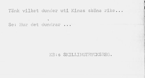 //// Tänk vilket dunder uti Kinas sköna rike... //// \ //// Se: Hur det dundrar ... //// KB:s SKILLINGTRYCKSREG. ////