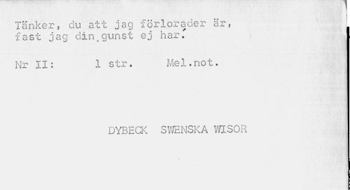 //// Tänker, du att jag förlorader är, //// fast jag din.gunst ej har. , //// Nr II: 1 str. Mel.not. //// DYBECK SWENSKA WISOR //// / ////