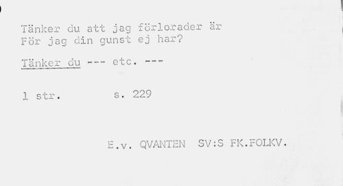 //// 1 //// Tänker du att jag förlorader är För jag din gunst ej har? //// Tänker du —- etc. --- //// » i »ii Wi.I i— -«»J m^iii»» //// 1 str. s. 229 //// E.v. QVANTEN SV:S FK.FOLKV. ////