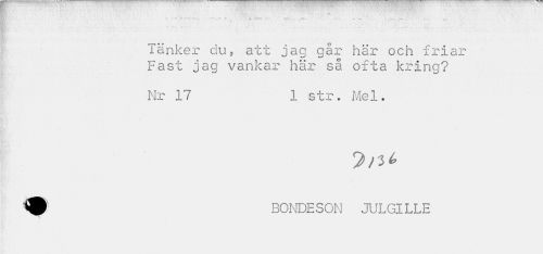 //// 1 //// ...f .a* . _.,, . ^ //// Tänker du, att jag går här och friar Fast jag vankar här så ofta krinq? //// Nr 17 1 str. Mel. //// W BONDESON X'LGILLE ////