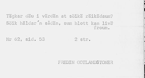 //// Tagkar däu i värdan at söikä räikädaum? //// Söik haldar n sådan, sum blott kan livä //// froun. //// Nr 62, sid. 53 2 str. ! //// ¦ //// FREDIN GOTLANDSTONER ¦ ////
