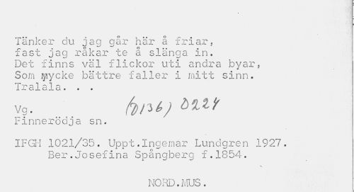 //// Tänker du jag går här å friar, fast jag råkar te å slänga in. Det finns väl flickor uti andra byar, Som j^ycke bättre faller i mitt sinn. fralala. . . //// Va. //// Finnerödja sn. //// IFGH 1021/35. Uppt.Ingemar Lundgren 1927. //// Ber.Josefina Spångberg f.1854. //// v, //// NORD.MUS. ////