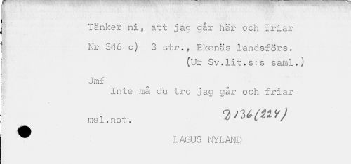 //// : //// Tänker ni, att jag går här och friar //// Nr 346 c) 3 str., Ekenäs landsförs. //// (Ur Sv.lit.s:s saml.) //// Jmf //// Inte må du tro jag går och friar mel. not. //// ^ LAGUS NYLAND ////