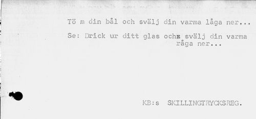 //// Tö m din bål och svälj din varma låga ner... //// Se: Drick ur ditt glas ochs^svälj din varma //// råga ner... //// KB:s SKILLINGTRYCKSREG. ////