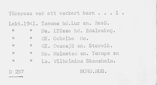 //// Törnrosa var ett vackert barn . . . 1 . //// Lekt.1941. Tanums hd.Lur sn. Resö. " " Ds. LTösse hd. Edsleskog. //// " " Gä. Ockelbo Mo. t? fl Gä. Ovansjö sn. Storvik. //// 11 " Ha. Halmstad sn. Torups sn //// " " La. Vilhelmina Skansholm. //// D 257 NORD.MUS. //// - - ¦¦ ¦ 1 ////