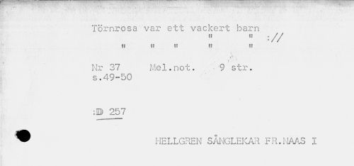 //// Törnrosa var ett vackert barn //// ii ii : // //// II Sf II IS II //// Nr 37 Mel.not. 9 str. s.49-50 //// :D 257 //// ^ HELLGREN SÅNGLEKAR .FR.NÄAS I ////