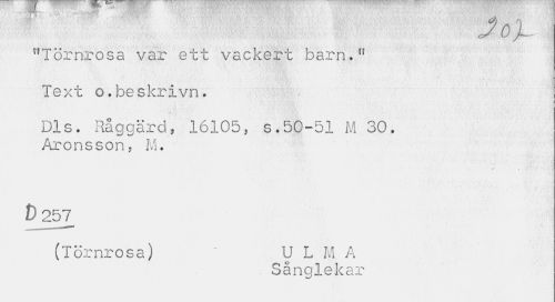 //// ö //// "Törnrosa var ett vackert barn." //// i //// Text o.be skrivn. //// Dis. Råggärd, 16105, s.50-51 m 30. Aronsson, m. //// t) 257 //// (Törnrosa) U L m a //// . Sånglekar ////