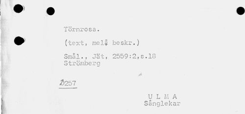 //// Törnrosa. //// m ^ . //// U (text, mel| beskr.) //// Smal., Jät, 2559:2,s.18 Strömberg //// [fy ¦ • •Vi! ', > ¦'/ //// #257 //// * //// U L M A //// , Sånglekar //// Hlv " Hr ////