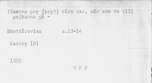 //// Töserna pry (bry?) våra dar, när som de till pojkarna gå - //// Skottårsvisa s.13-14 //// Kareby (B) //// 1381 //// V F F | //// t'- . , .'Ä.i' • ////
