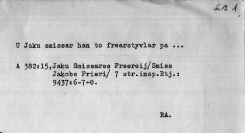//// J> //// II Jaku smissar han to frearstyvlar pa ••• //// A 382:15,Jaku Smissares Preereij/Smiss //// Jakobs Frieri/ J str.insp#Rtj.s 9437:6-7+8. //// RA. ////