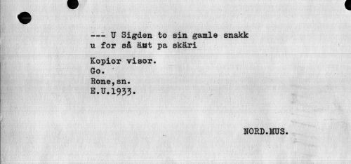 //// —- U Sigden to sin gamle snakk u for så äöt pa skäri //// Kopior visor, Go. * Rone, sn. //// E.U.1933. //// NORD.MUS. //// "—i ////