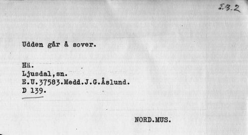 //// / //// Udden går å sover. Hä. //// Ljusdal,sn. //// E.U.37583.Medd.J.G.Åslund. //// D 139. //// NOHD.MUS. //// ' v ////