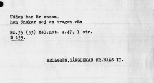 //// p //// I i //// i //// Udden han är ensam, //// han önskar sej en trogen vän //// i //// Nr.35 (33) Mel.not. s.47» 1 str. //// D 139. ! //// . //// HELLGREN,SÅNGLEKAR FR.NÄÄS II. //// 1 ////