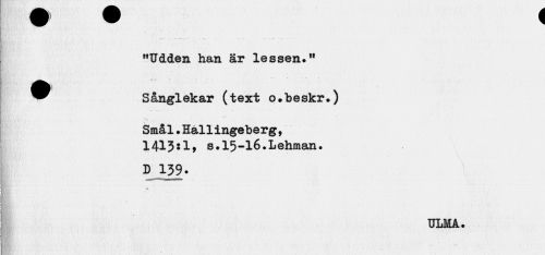 //// "Udden han är lessen#w //// • 1 ' ¦ s //// I //// Sånglekar (text o.beskr.) //// Smål•Hallingeberg, 1413*1, s.15-16.Lehman. //// D 139- //// m fp //// ULM A. //// I //// »fik,, v ////