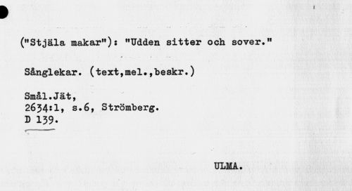 //// p //// ... . • v.- .• ... ' //// ("Stjäla makar"): "Udden sitter och sover." //// . . * ... » . //// Sånglekar, (text,mel.,beskr.) Smål.Jat, //// 2634:1, s.6, Strömberg. //// D 139- //// v //// ULMA. //// * 1 v ////