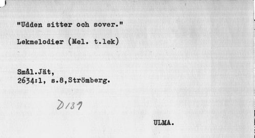 //// "Udden sitter och sover.* Lekmelodier (Mel. t.lek) //// Smål.Jät, //// 2634:1, s.8,Strömberg. //// 1 //// 2>/3i I //// i //// ULMA. | //// f= j //// i ////