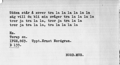 //// I //// t //// Udden står å sover tra la la la la la la säg vill du bli min svåger tra la la la la tror ja tra la la, tror ja tra la la tror ja tra la la, tra la la la la //// Ha* //// Torup sn. //// IFGH,869. Uppt.Ernst Nordgren. //// D 139* //// ___, //// HORD.MUS. i //// I //// i ////