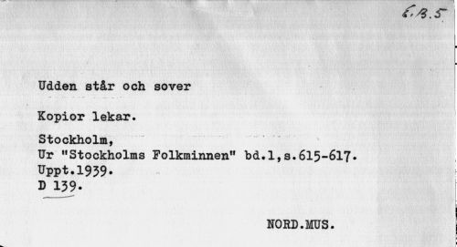//// I //// B //// Udden står och sover //// Kopior lekar. Stockholm, //// Ur "Stockholms Folkminnen" bd.l,s.615-617• Uppt.1959. //// D 139- //// j //// NORD.MUS. I //// i g ////