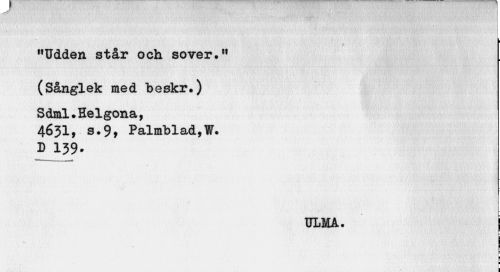 //// v" //// i.-', i . X; jV/®V" ! ^'j». j SV; ' • i • . ...:.','>'."' • >' « ' ^A® »i ->; !¦' ' ¦ :'•- JW ¦'), ' ''¦ .'¦.' ' 'i,i: äWjlfö» '' '' '' /*¦- '' ' i' }( ',, yl '' V ' ', v'„' -»V' //// "Udden står och sover." //// (Sånglek med beskr.) //// Sdml.Helgona, //// 463I, s.9, Palmblad,W. //// D 139. //// ULMA. | //// f //// 1 p //// k ////