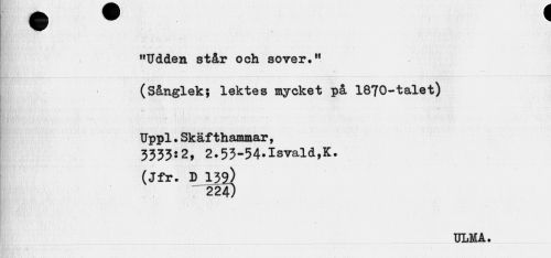 //// r> //// "Udden står och sover." //// (Sånglek; lektes mycket på 1870-talet) //// Uppl.Skäfthammar, 3333:2, 2.53-54»Isvald,K. //// (Jfr. D 139.) //// 224; //// » 4 //// ULMA. ////