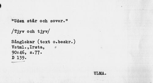 //// » //// "Uden står och sover." /Tjyv och tjyv/ //// ^ . ». ¦ 3". //// Sånglekar (text o»beskr.) Vstml.,Irsta, • //// 90:46, s.77. D 139- //// ULMA. ////
