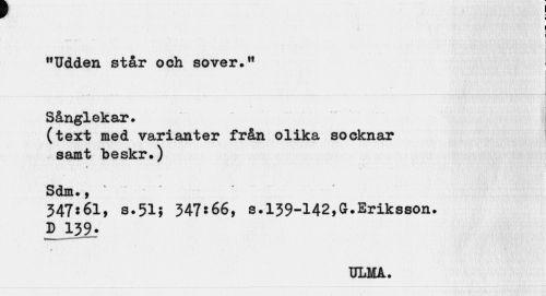 //// i //// I //// i //// , , i //// i i i i //// "Udden står och sover•11 I //// i //// • - • ... . t Sånglekar. //// (text med varianter från olika socknar samt beskr.) //// u //// 0 dm. , //// 347:61, s.51; 347566, s.139-142,G.Eriksson. //// 1 139- //// r //// ULMA. ////