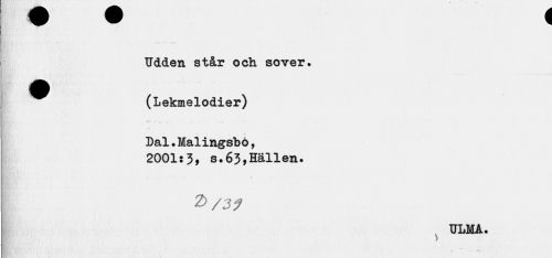 //// W V //// Udden står och sover. ^jjjj^ - ~ //// (Lekmelodier) //// Dal ?Malingshö, 2001:3, s.63,Hällen. //// Z>/3? //// ULMA. ////