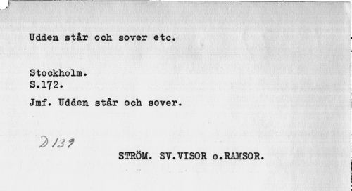 //// ¦ ! //// i //// Udden står och sover etc. //// ! //// s //// Stockholm. I //// S.172. //// j //// Jmf. Udden står och sover. //// 1 //// 2>/j? [ //// STRÖM. ST.VISOR o.RAMSOR. //// C //// i //// c //// i ////