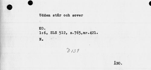 //// • w * //// nr', il ~ //// Udden står och sover KO. //// 1:6, SLS 512, s.765,nr.421. //// • i //// i BO. ////