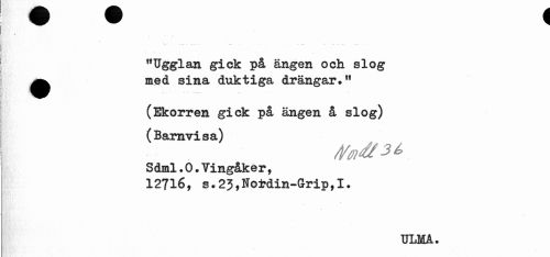 //// « //// "Ugglan gick på ängen och slog ^ med sina duktiga drängar." //// (Ekorren gick på ängen å slog) (Barnvisa) //// Sdml.0.Vingåker, //// 12716, s.23,Nofcdin-Grip,I. //// ULMA. ////