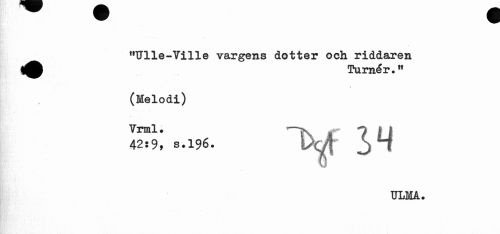 //// "Ulle-Ville vargens dotter och riddaren //// Turnér." //// » //// (Melodi) //// Vrml. —^ *? I I //// 42:9, S.196. \y(± JJ H //// ULMA. ////