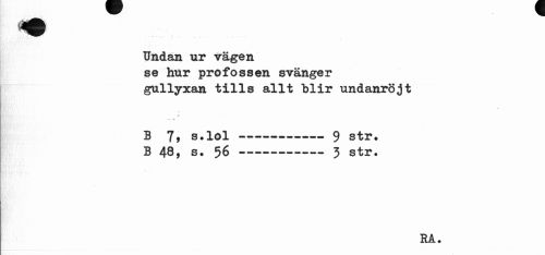 //// Undan ur vägen //// se hur profossen svänger //// gullyxan tills allt blir undanröjt //// 41 //// B 7, s.lol---— 9 str. //// B 48, s. 56---3 str. //// RA. ////